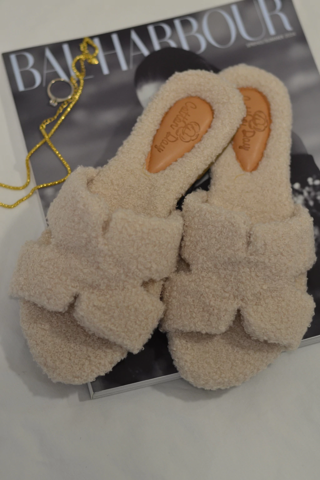 O material do slipper é de pelo teddy fake, remetendo à uma lã de carneiro bem quentinha e macia. O solado é de borracha, então pode ser usado tanto dentro de casa como em áreas externas. A pantufa tende a lacear após alguns usos.