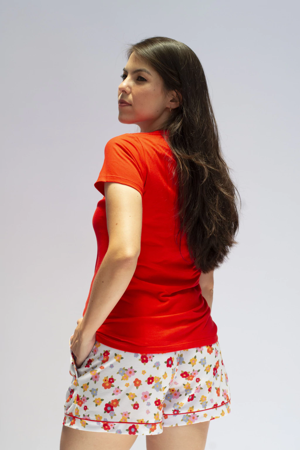 A camiseta é composta por uma modelagem básica e simples, porém com um toque fashion na estampa da palavra "bonjour" que traz as mesmas cores e padronagem do shorts. Essa peça é fabricada em malha 100% algodão penteado, oferecendo uma sensação suave e respirável, ideal para noites quentes.